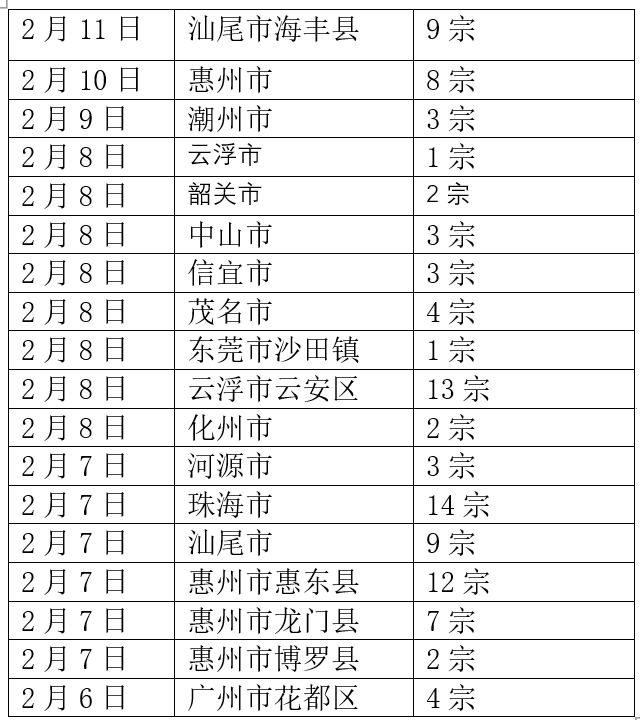 2月6日以来,广东多个市县区收储闲置土地一览,新京报贝壳财经记者整理。