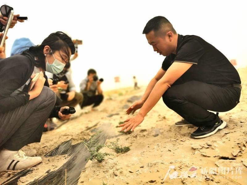 若羌县林业和草原局党组书记、副局长李宾(右一)在介绍黑枸杞种植。石榴云/新疆日报记者 曹华摄