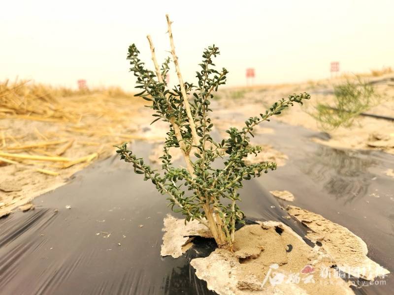 在台特玛湖东侧与库姆塔格沙漠接壤区域,记者看到,7.8万亩空白带锁边工程已经完工,一眼望不到边的草方格和沙障牢牢地将流沙锁住。而在靠近台特玛湖的湖边区域,当地则探索工程+生物治沙模式,在两行草方格的中间种植黑枸杞、酸枣、沙棘等,既能防风固沙还能产生经济效益。这些治沙工程成为了环塔克拉玛干沙漠3046公里的绿色防护屏障的重要组成部分。